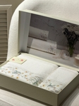 Комплект рушників марки преміум-класу Tivolyo Home складаються з двох махрових рушників розміром 50х100 та 75х150. Вироби виконані зі 100% бавовни найвищої якості. Тканина – махра, дуже м’яка на дотик. Рушники оформлені красивим квітковим принтом на кремовому полотні, тонкою смужкою ажурної тасьми та фірмовим логотипом. Рушники відмінно вбирають вологу, забезпечують довгострокове використання через високу якість. До цього комплекту рушників Ви можете придбати розкішний жіночий махровий халат або чудовий комплект постільної білизни з будь-якої колекції марки. Комплект рушників упакований у гарну подарункову коробку, чудово підійде для подарунка Вашим близьким.